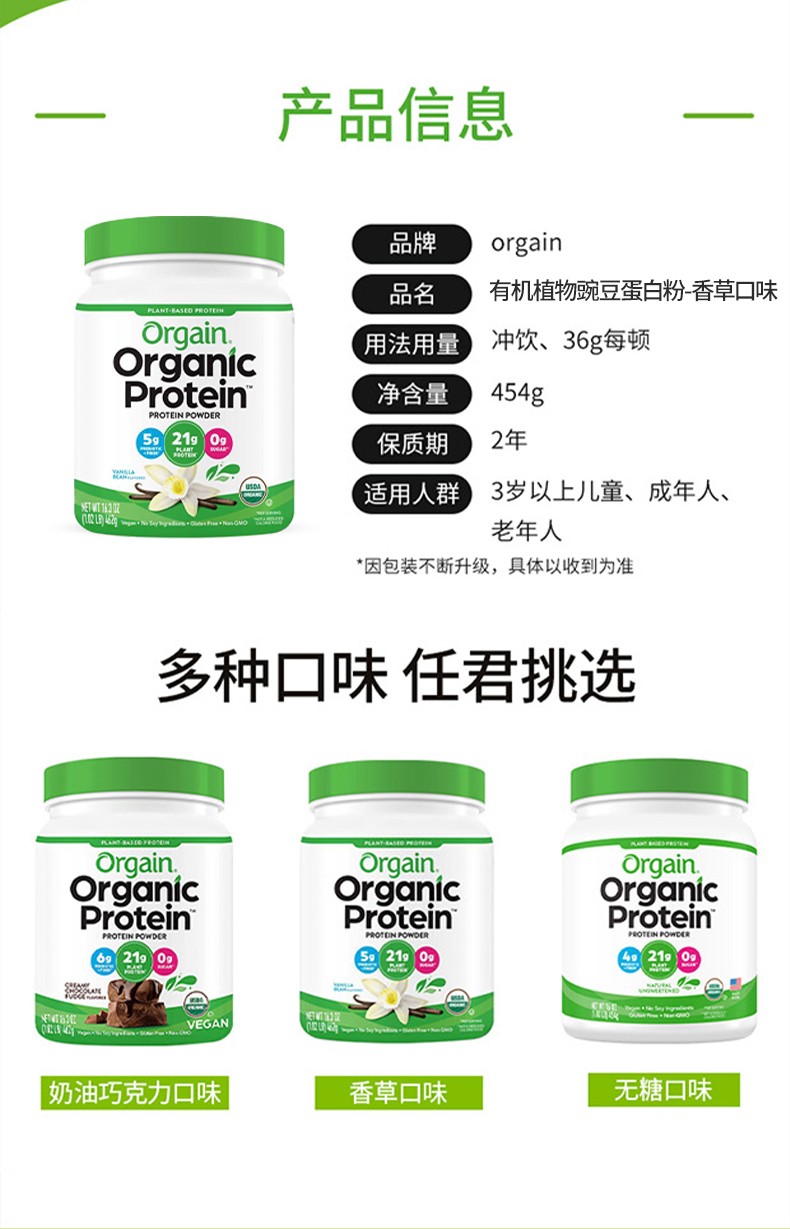 Orgain傲感有机植物豌豆蛋白粉甜香草口味462g