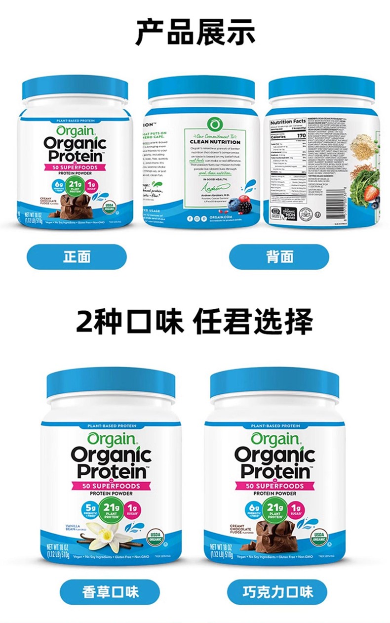 Orgain傲感有机植物蛋白复合超级食品粉香草口味510g