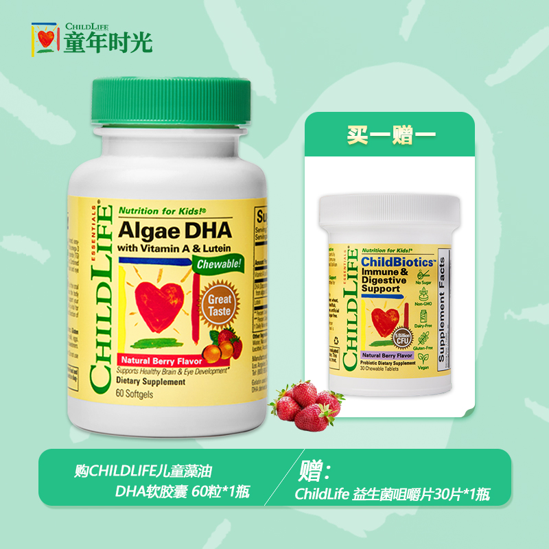 ChildLife童年时光儿童藻油DHA60粒/瓶【买即赠益生菌咀嚼片30片26.3月】