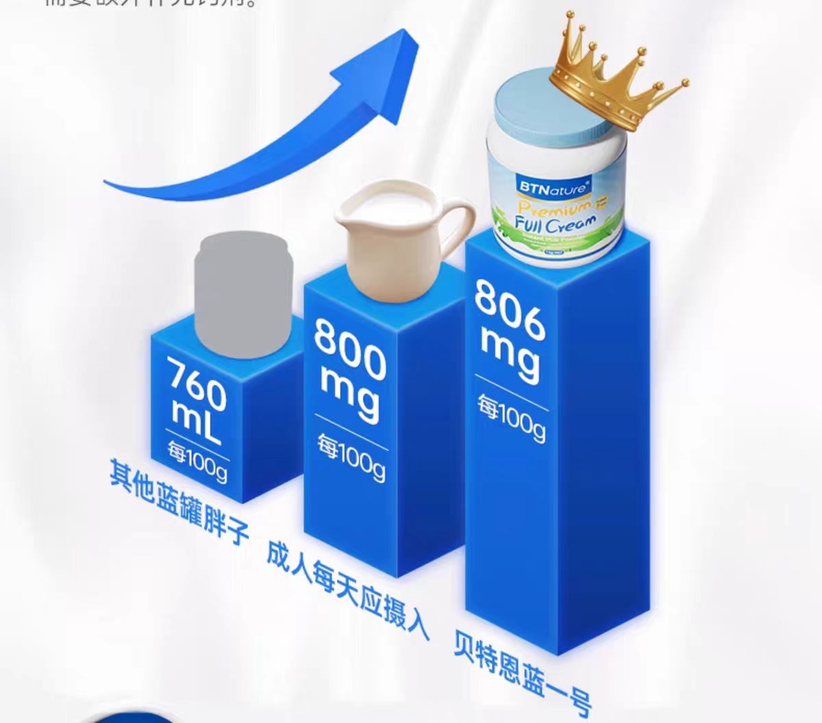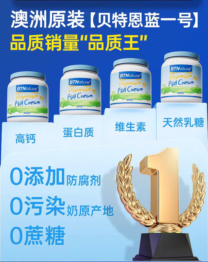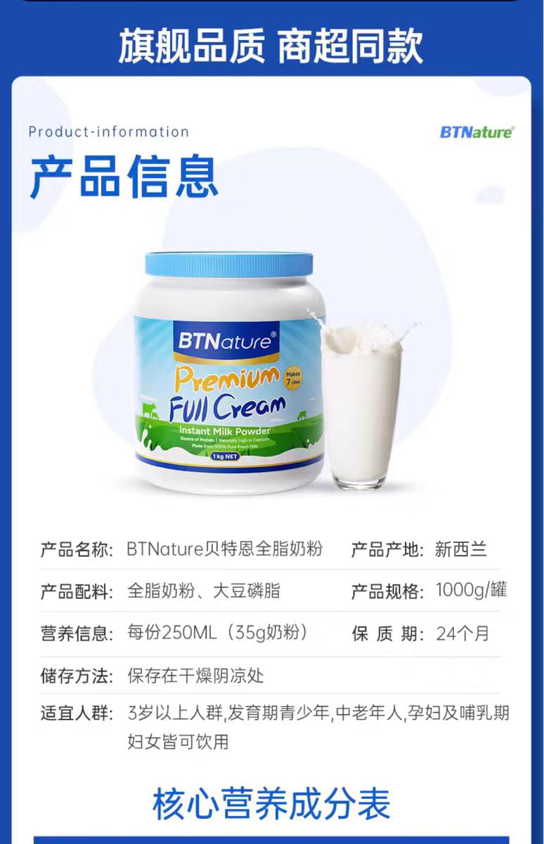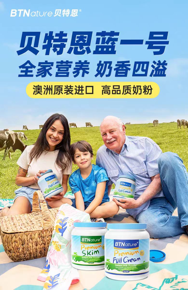 新西兰版本 贝特恩(BTNature)蓝一号成人全脂高钙牛奶粉 1kg/罐