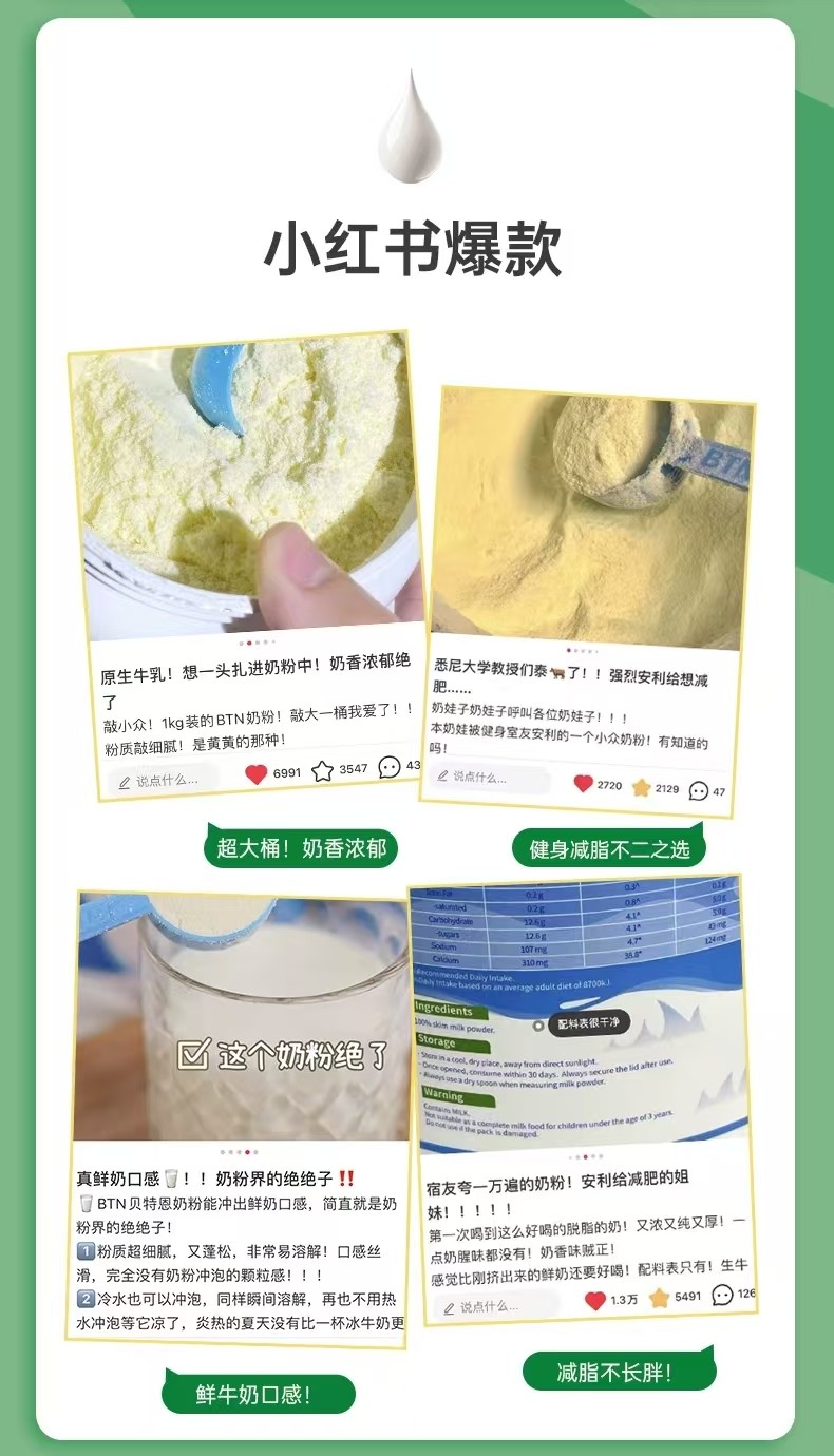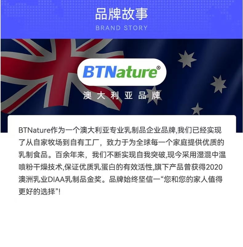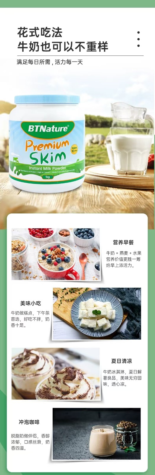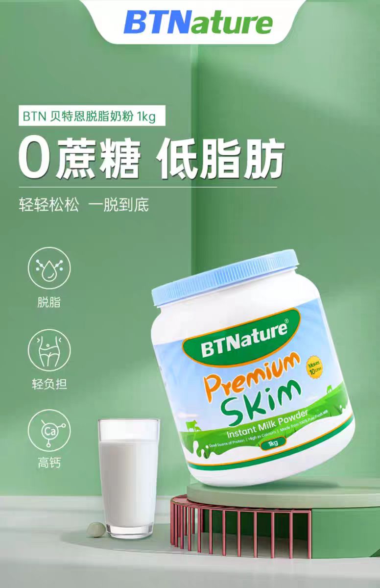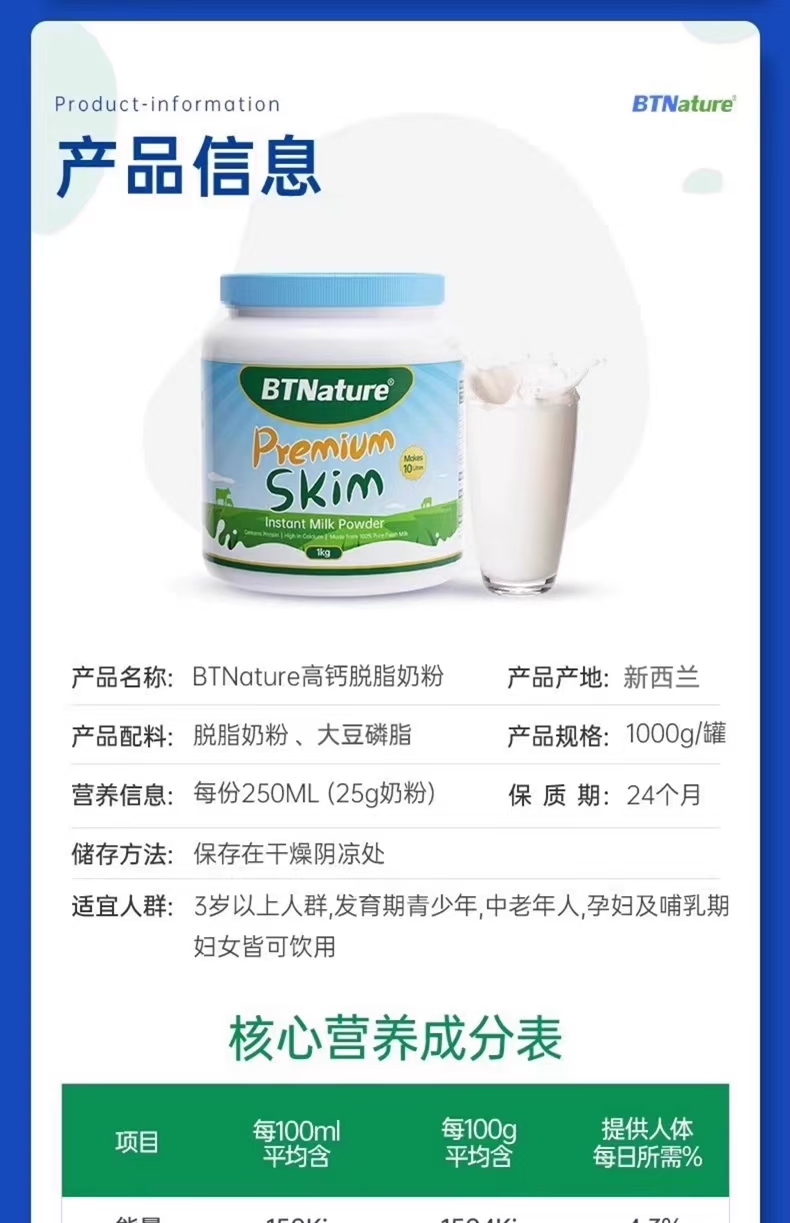 新西兰版本 贝特恩(BTNature)蓝一号成人脱脂高钙牛奶粉 1kg/罐