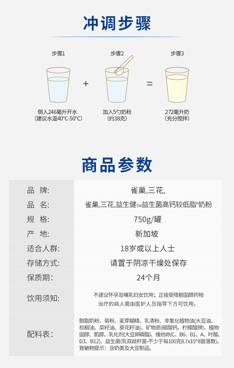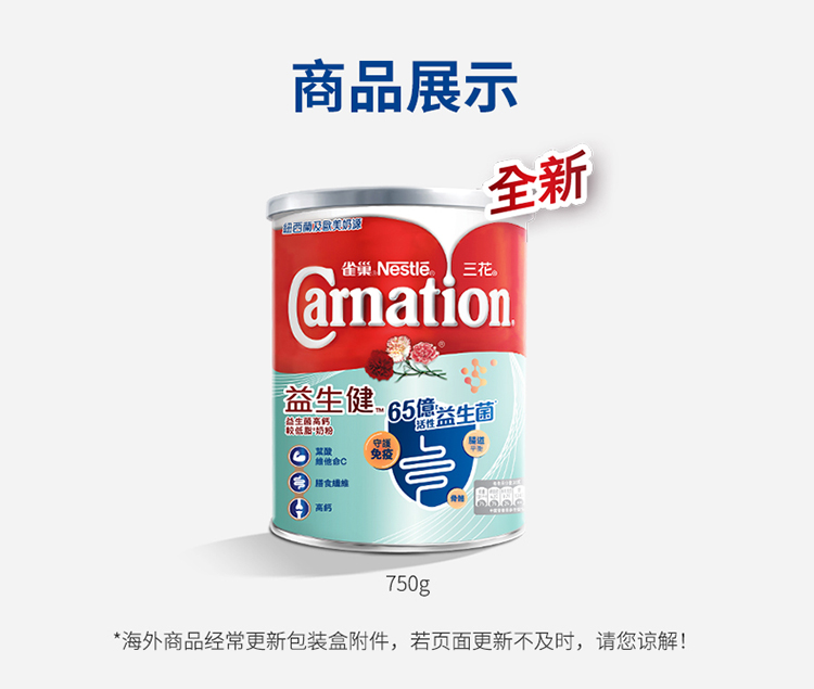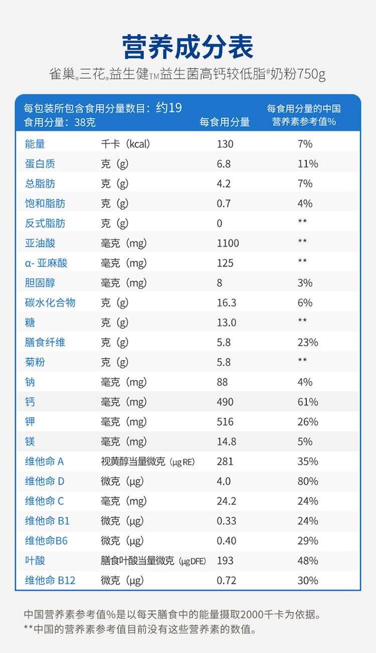 雀巢三花 益生健益生菌高钙较低脂奶粉750g