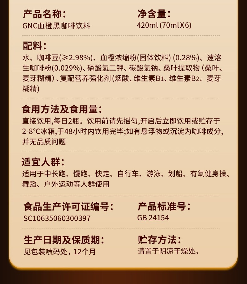 GNC/健安喜 血橙黑咖啡饮料(70ml*6)