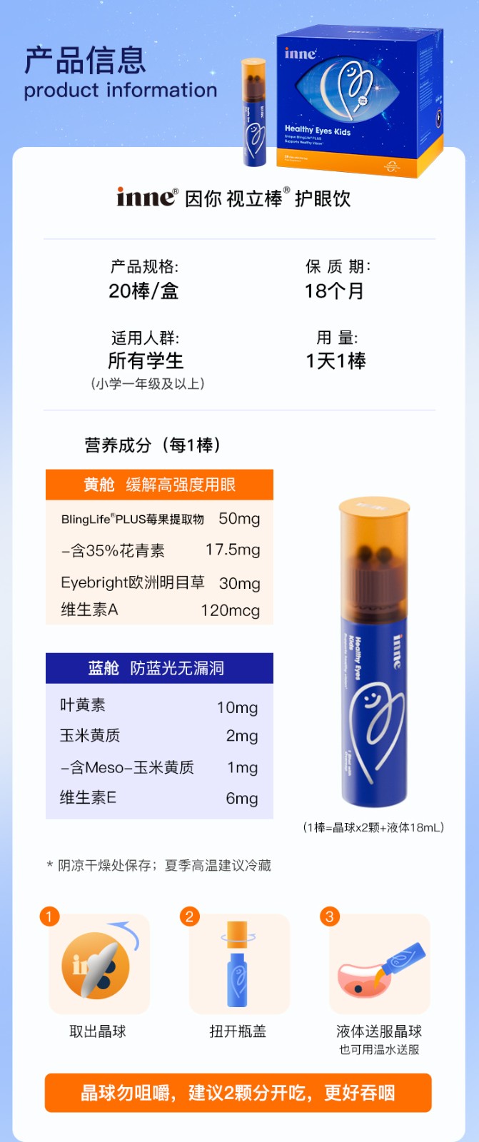 【中文使用说明+防伪码】inne视力棒叶黄素护眼饮 20瓶/盒